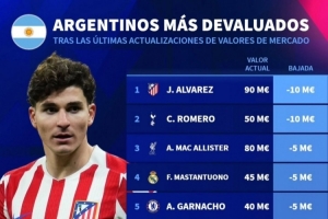 阿根廷球员身价下跌榜:阿尔瓦雷斯、罗梅罗下跌1000万欧最多