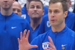 比赛最后时刻,杜克领先2分并握有球权后场底线发球。他在球队发出球后指挥球员向前场推进导致最后被抢断三分绝杀。