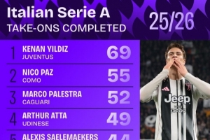 本赛季意甲成功过人榜:伊尔迪兹69次居首,尼科·帕斯55次第二