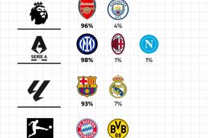 五大联赛夺冠概率:阿森纳96%,拜仁、巴黎99%,巴萨93%,国米98%